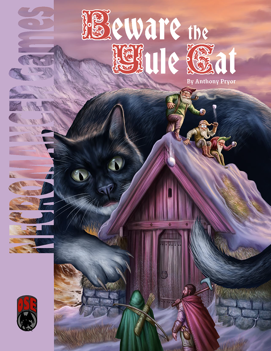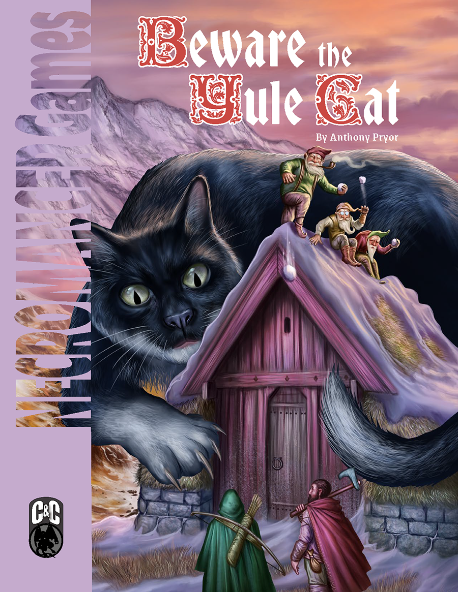 Inspired by the beloved works of Icelandic poet Jóhannes úr Kötlum, Beware the Yule Cat is a holiday-themed adventure for 4–6 characters of Tier 2 (Levels 5–6) available in the 5e, Castles & Crusades, and Old-School Essentials rules systems. As the adventurers face the wrath of the ferocious Yule Cat, they must also deal with the cruel pranks of the Yule Lads, who are determined to spoil Yule for everyone. Things go from bad to worse when the party discovers that the Jólasveinar have kidnapped the mayor's infant son, and taken him to their lair on nearby Snow Mountain, possibly bound for Grýla's stewpot! Köldhorn seems bound for a cold, dark Yuletide, but the adventurers may have a chance to make it merry for all.